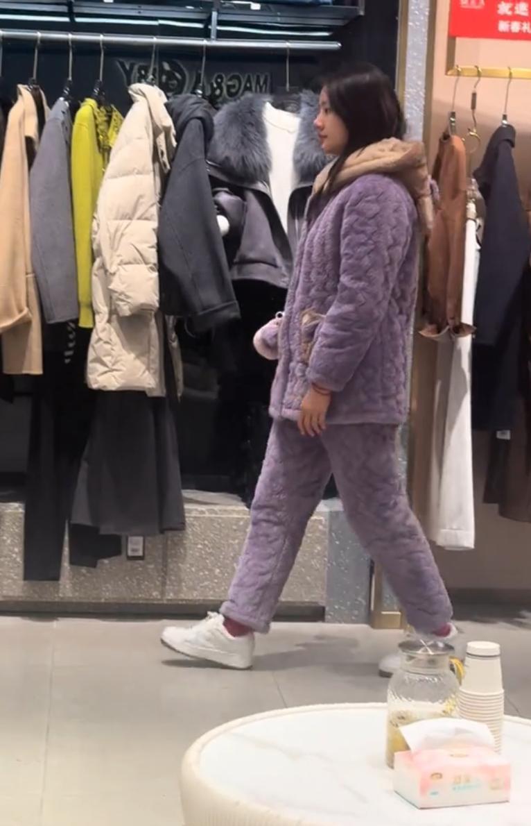 有网友偶遇回澧县老家过年的任敏,穿着厚实臃肿的湖南“省服”,踱着步在商场里闲逛。
